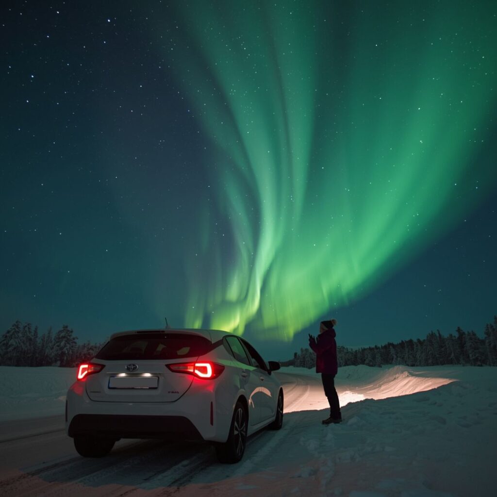 - Self-guided aurora hunt can be very rewarding, giving you the freedom to stop for photography or quiet observation. However, never stop in the middle of the road in the dark. If you need to pull over, use a bus stop, designated parking area, or lay-by. Keep your engine running and lights on so your car battery doesn’t drain, you don’t want to get stuck in the middle of nowhere. Also, make sure you have enough fuel, as gas stations are not around every turn in Lapland.